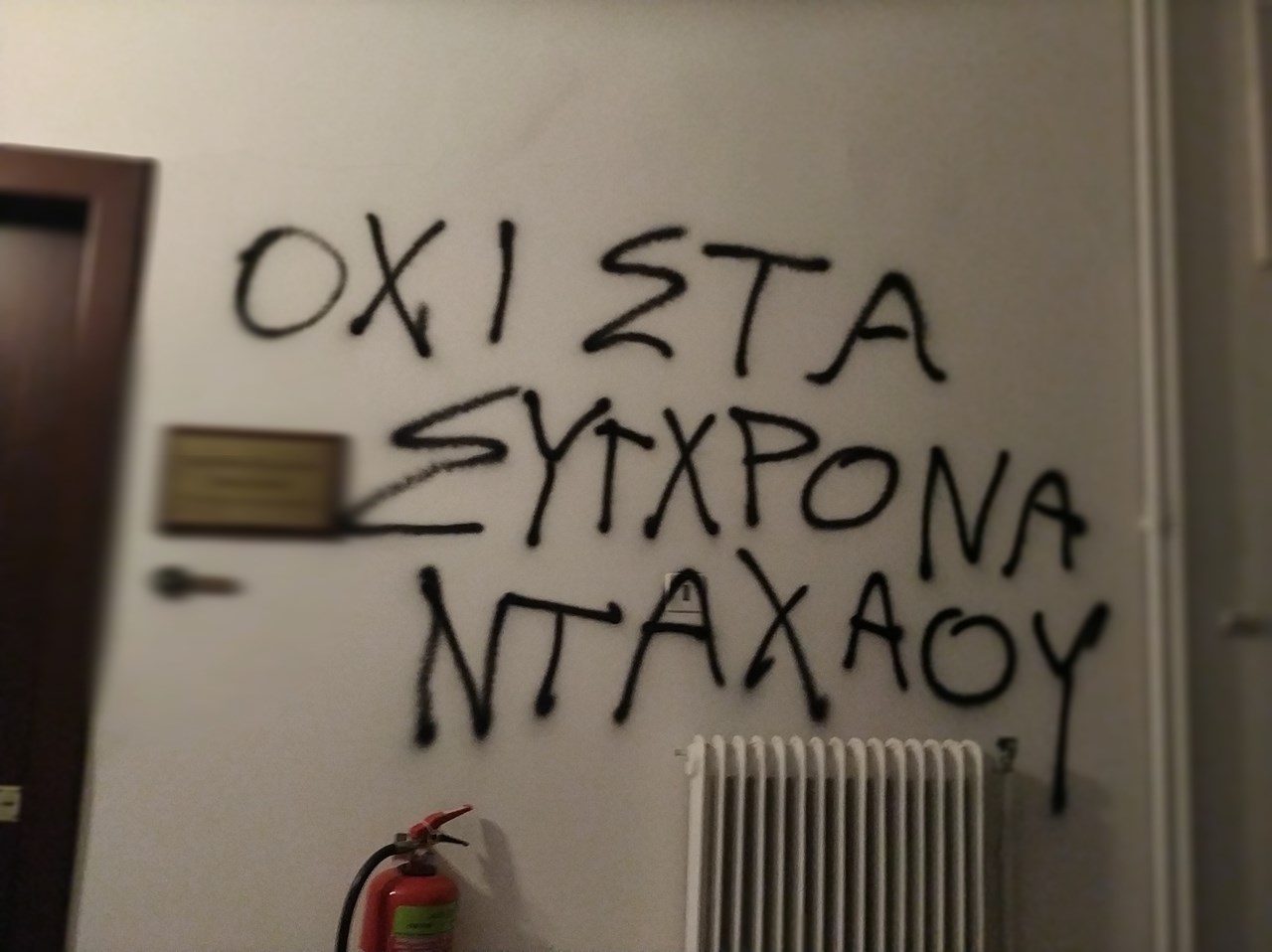 Οι νεαροί, αποχώρησαν, αφού προηγουμένως έγραψαν συνθήματα στους τοίχους για τα κλειστά κέντρα κράτησης μεταναστών.