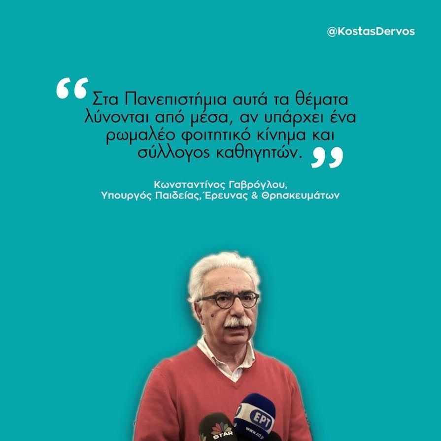 Χαρακτηριστικά τόνισε: «Ο κύριος Γαβρόγλου δηλώνει αναρμόδιος ως υπουργός Παιδείας να αντιμετωπίσει τις εγκληματικές πράξεις που συμβαίνουν μέσα στα Πανεπιστήμια.