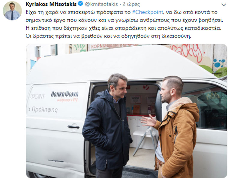«Είχα τη χαρά να επισκεφτώ πρόσφατα το Checkpoint να δω από κοντά το σημαντικό έργο που κάνουν και να γνωρίσω ανθρώπους που έχουν βοηθήσει. Η επίθεση που δέχτηκαν χθες είναι απαράδεκτη και απολύτως καταδικαστέα. Οι δράστες πρέπει να βρεθούν και να οδηγηθούν στη δικαιοσύνη», έγραψε ο πρόεδρος της Νέας Δημοκρατίας.