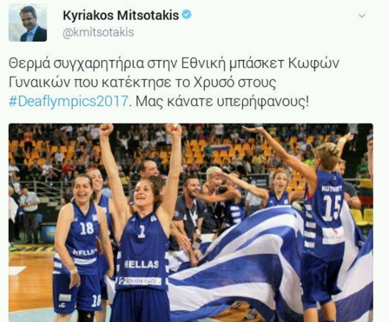 «Θερμά συγχαρητήρια στην Εθνική Μπάσκετ Κωφών Γυναικών που κατέκτησε το Χρυσό τους Deaflympics2017. Μας κάνατε υπερήφανους!».