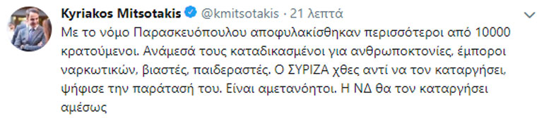 «Με τον νόμο Παρασκευόπουλου αποφυλακίσθηκαν περισσότεροι από 10.000 κρατούμενοι. Ανάμεσά τους καταδικασμένοι για ανθρωποκτονίες, έμποροι ναρκωτικών, βιαστές, παιδεραστές. Ο ΣΥΡΙΖΑ χθες, αντί να τον καταργήσει, ψήφισε την παράτασή του. Είναι αμετανόητοι. Η ΝΔ θα τον καταργήσει αμέσως», έγραψε στον λογαριασμό του στο Twitter ο αρχηγός της αξιωματικής αντιπολίτευσης.