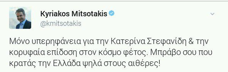 Την επιβράβευσή του και τη στήριξή του, δε σταματάει να δείχνει, ο Πρόεδρος της Νέας Δημοκρατίας, Κυριάκος Μητσοτάκης, στους Έλληνες αθλητές. Για τη νέα διάκριση της Ολυμπιονίκη μας, Κατερίνας Στεφανίδη ο Κ.Μητσοτάκης, έγραψε στον προσωπικό του λογαριασμό στο twitter: