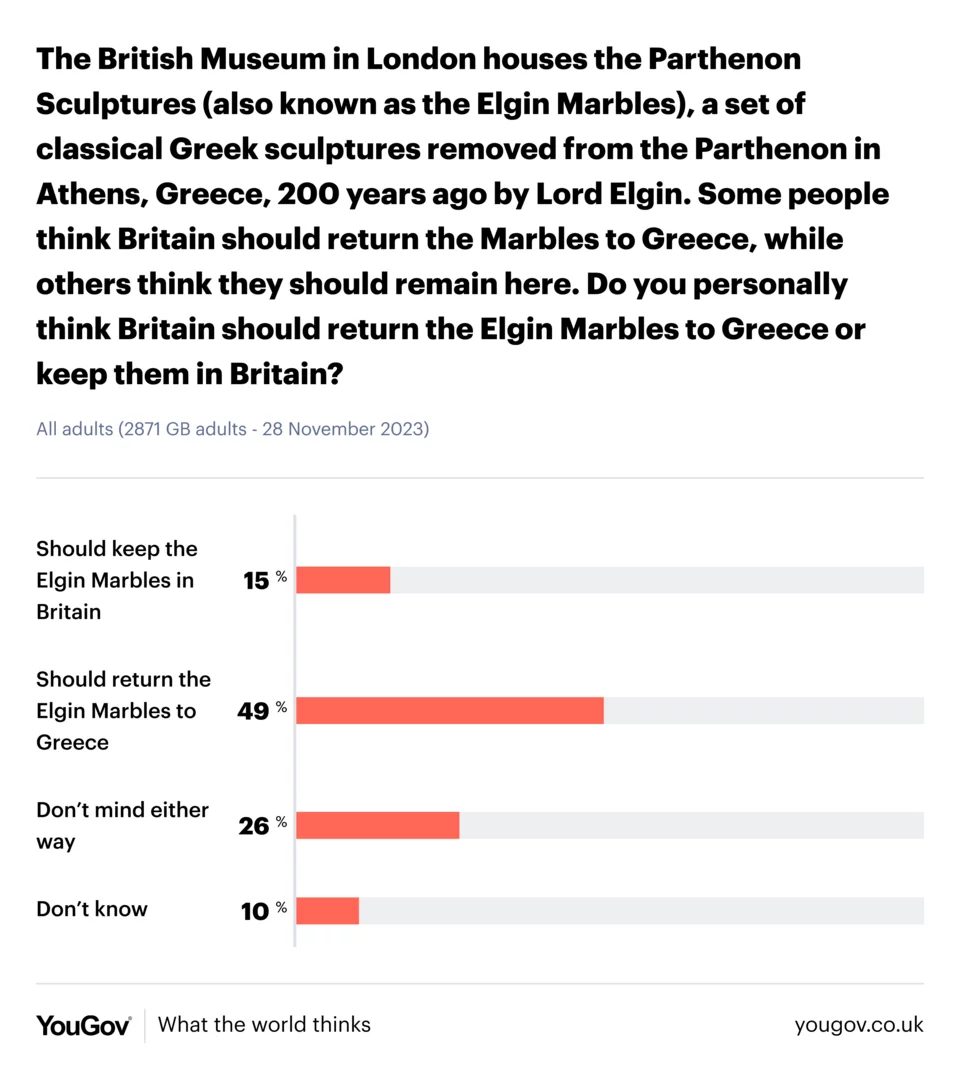 Σε ερώτηση αναφορικά με το εάν πρέπει να επιστραφούν τα Γλυπτά του Παρθενώνα στην Ελλάδα, ένας στους δύο Βρετανούς (ποσοστό 49%) θεωρεί ότι πρέπει να δοθούν πίσω στην Ελλάδα έναντι μόλις του 15% που θέλει να παραμείνουν στη Βρετανία. Ένα 26% δεν έχει πρόβλημα με καμία από τις δύο επιλογές, ενώ 10% απαντά «δεν γνωρίζω».
