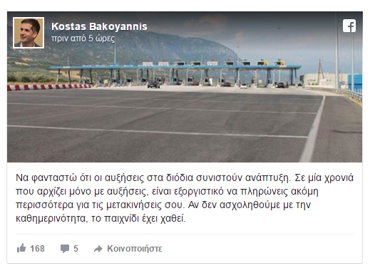 Ο Κώστας Μπακογιάννης έγραψε συγκεκριμένα: «Να φανταστώ ότι οι αυξήσεις στα διόδια συνιστούν ανάπτυξη. Σε μία χρονιά που αρχίζει μόνο με αυξήσεις, είναι εξοργιστικό να πληρώνεις ακόμη περισσότερα για τις μετακινήσεις σου. Αν δεν ασχοληθούμε με την καθημερινότητα, το παιχνίδι έχει χαθεί…».