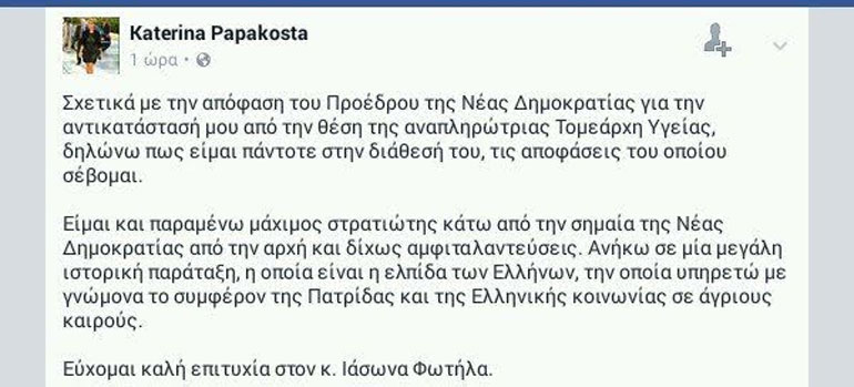 «Σχετικά με την απόφαση του προέδρου της Νέας Δημοκρατίας για την αντικατάστασή μου από την θέση της αναπληρώτριας Τομεάρχη Υγείας, δηλώνω πως είμαι πάντοτε στην διάθεσή του, τις αποφάσεις του οποίου σέβομαι», δήλωσε η κα Κατερίνα Παπακώστα, μέσω του προσωπικού της λογαριασμού στο Facebook.
