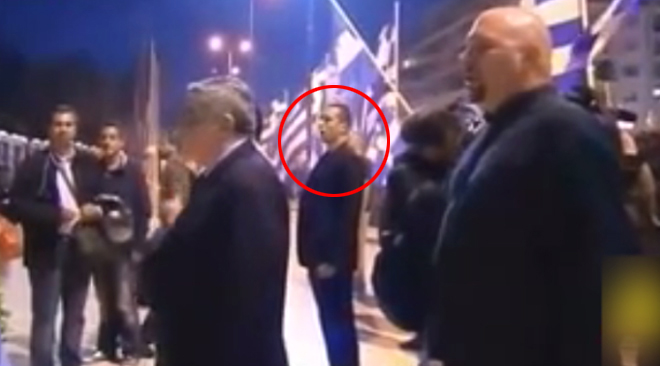 Καμαρώστε τον αρχηγό της Χρυσής Αυγής, Νίκο Μιχαλολιάκο με υβριστικό τρόπο να διατάσσει επιτακτικά άνδρα των ΜΑΤ, αποκαλώντας τον «ρεμάλι», να «καθίσει προσοχή» την ώρα που οι ομοϊδεάτες του τραγουδούν τον εθνικό ύμνο.