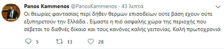 Με ανάρτησή του στον προσωπικό του λογαριασμό στο Twitter ο υπουργός Άμυνας, Πάνος Καμμένος, κάνει λόγο για ανυπόστατες θεωρίες φαντασίας που δεν εξυπηρετούν την Ελλάδα τα περί δήθεν θερμών επεισοδίων, απαντώντας με αυτό τον τρόπο στις δηλώσεις του αντιπροέδρου των ΑΝΕΛ Παναγιώτη Σγουρίδη.
