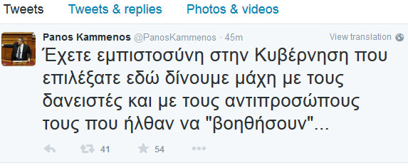 «Έχετε εμπιστοσύνη στην κυβέρνηση που επιλέξατε εδώ δίνουμε μάχη με τους δανειστές και με τους αντιπροσώπους τους που ήλθαν να “βοηθήσουν”…» έγραψε ο κ. Καμμένος στον προσωπικό του λογαριασμό στο συγκεκριμένο μέσο κοινωνικής δικτύωσης.