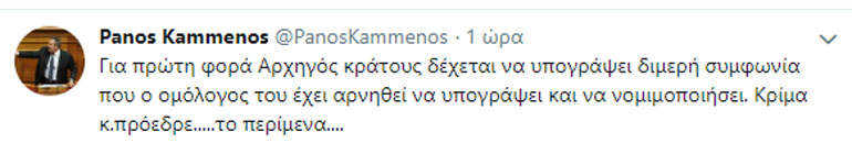 Με ανάρτησή του στο Twitter το βράδυ του Σαββάτου ο Πάνος Καμμένος υποστήριξε ότι ο Πρόεδρος της Δημοκρατίας, Προκόπης Παυλόπουλος, έπρεπε να ακολουθήσει την στάση του Σκοπιανού ομολόγου του και να μην υπογράψει τη Συμφωνία των Πρεσπών.