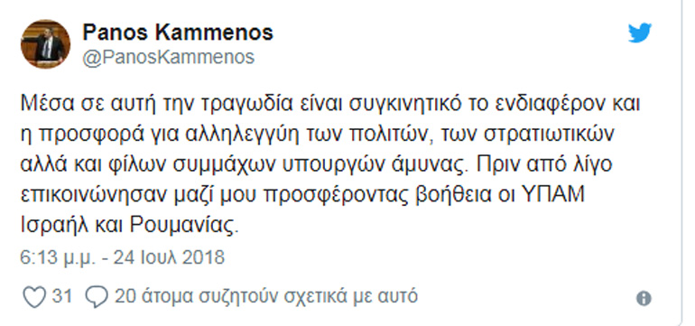 «Μέσα σε αυτή την τραγωδία είναι συγκινητικό το ενδιαφέρον και η προσφορά για αλληλεγγύη των πολιτών, των στρατιωτικών αλλά και φίλων συμμάχων υπουργών Άμυνας. Πριν από λίγο επικοινώνησαν μαζί μου προσφέροντας βοήθεια οι Άμυνας Ισραήλ και Ρουμανίας» αναφέρει σε ανάρτησή του στον προσωπικό του λογαριασμό στο Twitter, ο υπουργός Άμυνας, Πάνος Καμμένος.