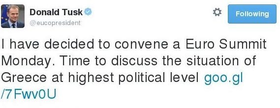Τη στιγμή που η τρίωρη συνεδρίαση του Eurogroup στο Λουξεμβούργο δεν απέδωσε καρπούς, όπως άλλωστε προεξοφλούσαν Ευρωπαίοι αξιωματούχοι κατά την είσοδό τους στο κτήριο όπου πραγματοποιούνταν οι διαβουλεύσεις, ο πρόεδρος του Ευρωπαϊκού Συμβουλίου, Ντόναλντ Τουσκ, έδωσε την είδηση της βραδιάς, αποκαλύπτοντας ότι την προσεχή Δευτέρα 22 Ιουνίου θα πραγματοποιηθεί Έκτακτη Σύνοδος Κορυφής.