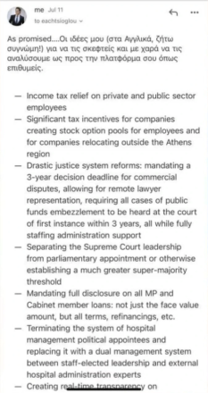 «Βλέπω κάθε βίντεό της να στρέφει τα βέλη της σ’ εμένα, λες και εγώ είμαι ο Μητσοτάκης. Την αποκαλώ Έφη, όπως τον Αλέξη τον αποκαλώ πάντα Αλέξη, κι αντί για χέρι φιλίας το θεωρεί υποτίμηση. Βλέπω να διακινεί σενάρια, ότι ήμουν συνεργάτης του Μητσοτάκη, και ποιος την διαψεύδει; Ο Γιάννης Πρετεντέρης», σημειώνει και συνεχίζει «Τον Ιούλιο της είχα στείλει προτάσεις για να βάλει, αν ήθελε, στο πρόγραμμά της. Να συνδράμω. Να συζητήσουμε. Να είμαι παρών. Είναι σε αυτό εδώ το χαρτί, το οποίο δημοσιοποιώ. Δε μου απάντησε ποτέ – είναι δικαίωμά της-, όμως εγώ θεώρησα ηθική μου υποχρέωση να συνεισφέρω στον αγώνα της».