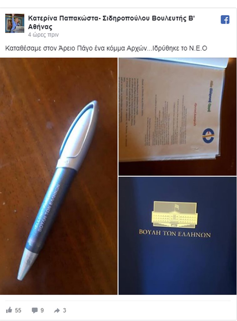 Κατατέθηκε σήμερα από την Κατερίνα Παπακώστα – Σιδηροπούλου στον Άρειο Πάγο η ιδρυτική διακήρυξη του νέου κόμματος «Νέα Ελληνική Ορμή» (Ν.Ε.Ο.).