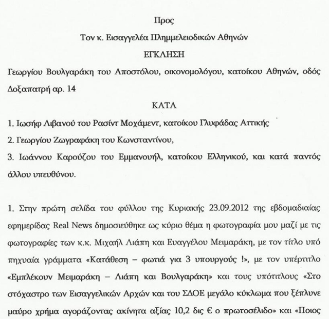 Μήνυση κατά του Ιωσήφ Λιβανού, του Γεωργίου Ζωγραφάκη, του Ιωάννη Καρούζου αλλά και κατά παντός άλλου υπευθύνου, κατέθεσε ο πρώην υπουργός Γιώργος Βουλγαράκης, όπως έκανε γνωστό μέσα από τον λογαριασμό του στο twitter.