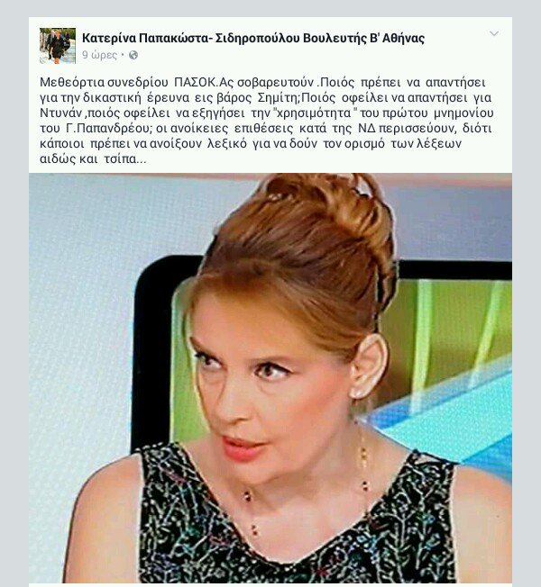 «Μεθεόρτια συνεδρίου ΠΑΣΟΚ. Ας σοβαρευτούν. Ποιός πρέπει να απαντήσει για την δικαστική έρευνα εις βάρος Σημίτη; Ποιος οφείλει να απαντήσει για Ντυνάν, ποιός οφείλει να εξηγήσει την “χρησιμότητα ” του πρώτου μνημονίου του Γ. Παπανδρέου; οι ανοίκειες επιθέσεις κατά της ΝΔ περισσεύουν, διότι κάποιοι πρέπει να ανοίξουν λεξικό για να δουν τον ορισμό των λέξεων αιδώς και τσίπα…»