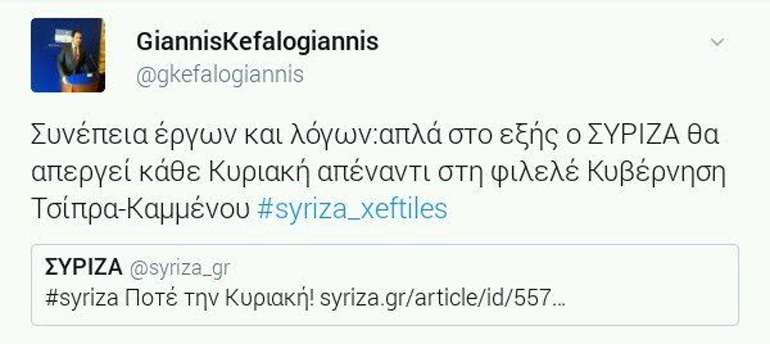 Υπενθυμίζοντας την ανακοίνωση που είχε κάνει το Τμήμα Εργατικής Πολιτικής του ΣΥΡΙΖΑ, στις 11/4/2014, με θέμα: «Υπερασπιζόμαστε την κυριακάτικη αργία. Δεν ψωνίζουμε. Δεν εργαζόμαστε», έγραψε με ιδιαίτερα καυστικό ύφος, μέσω του προσωπικού λογαριασμού στο Twitter: «Συνέπεια έργων και λόγων: απλά στο εξής ο ΣΥΡΙΖΑ θα απεργεί κάθε Κυριακή απέναντι στη φιλελέ Κυβέρνηση Τσίπρα-Καμμένου».