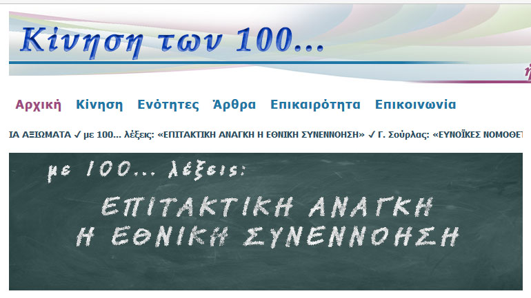 Ανακοίνωση εξέδωσε η «Κίνηση των 100» ζητώντας εθνική συνεννόηση, καθότι κρίνεται επιτακτική ανάγκη εν μέσω μάλιστα της πρωτοφανούς κρίσης.