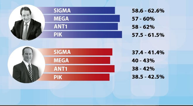 Σύμφωνα με τα exit polls που δημοσιοποίησαν στις 18.01 οι σταθμοί παγκύπριας εμβέλειας, νέος Πρόεδρος της Δημοκρατίας εκλέγεται ο Νίκος Αναστασιάδης.