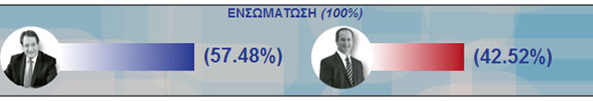 Σε ενσωμάτωση 100%, ο Αναστασιάδης Νίκος συγκεντρώνει 57,48% και ο Μαλάς Σταύρος 42,52%.