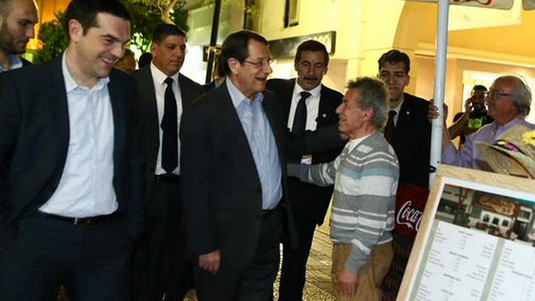 Κατά την άφιξή τους στην οδό Λήδρας, Αναστασιάδης και Τσίπρας συνομίλησαν με θαμώνες σε εστιατόρια και έβγαλαν αναμνηστικές φωτογραφίες.