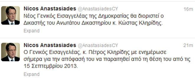 Την απόφασή του να παραιτηθεί από τη θέση του, από τις 15 Σεπτεμβρίου 2013, γνωστοποίησε σήμερα στον πρόεδρο της Κυπριακής Δημοκρατίας ο γενικός εισαγγελέας Πέτρος Κληρίδης, όπως ανακοίνωσε ο Ν. Αναστασιάδης μέσω του προσωπικού του λογαριασμού στο twitter.
