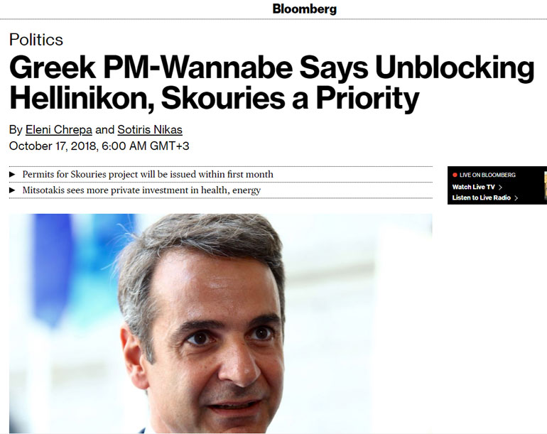 Συνέντευξη στο πρακτορείο Bloomberg παραχώρησε ο πρόεδρος της Νέας Δημοκρατίας Κυριάκος Μητσοτάκης εν όψει της σημερινής Συνόδου του Ευρωπαϊκού Λαϊκού Κόμματος στις Βρυξέλλες και της συνάντησης που θα έχει με τον πρόεδρο της Κομισιόν Ζαν Κλοντ Γιούνκερ.