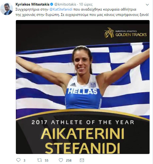 Τα συγχαρητήρια του στην Κατερίνα Στεφανίδη έδωσε ο πρόεδρος της ΝΔ Κυριάκος Μητσοτάκης μέσω του προσωπικού λογαριασμού του στο Twitter. Συγκεκριμένα ο κ. Μητσοτάκης έγραψε: “Συγχαρητήρια στην @KatStefanidi που αναδείχθηκε κορυφαία αθλήτρια της χρονιάς στην Ευρώπη. Σε ευχαριστούμε που μας κάνεις υπερήφανους ξανά!”