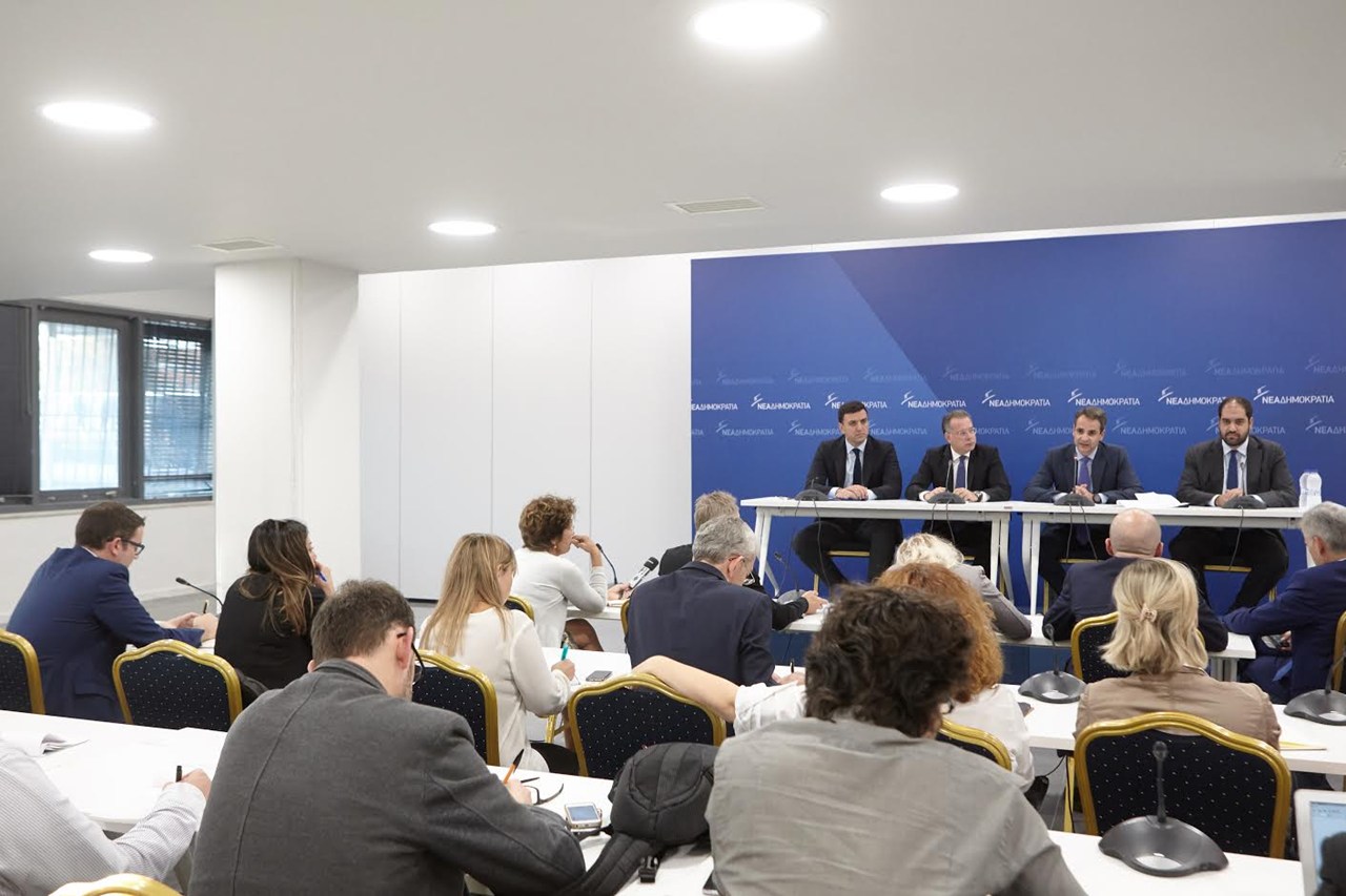 Τη δέσμευση του, πως θα απευθύνεται στους Έλληνες πολίτες με τη γλώσσα της αλήθειας, όσο σκληρή και είναι αυτή, υπογράμμισε μιλώντας σε ξένους δημοσιογράφους ο Πρόεδρος της Νέας Δημοκρατίας, Κυριάκος Μητσοτάκης. Η συνάντηση με την πολυμελή ομάδα δημοσιογράφων του Ευρωπαϊκού και Διεθνούς Τύπου πραγματοποιήθηκε στα κεντρικά γραφεία της Νέας Δημοκρατίας στο Μοσχάτο.