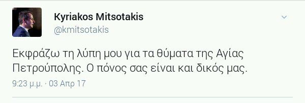 Συγκεκριμένα, ο Πρόεδρος της Νέας Δημοκρατίας, έγραψε χαρακτηριστικά: «Εκφράζω τη λύπη μου για τα θύματα της Αγίας Πετρούπολης. Ο πόνος σας είναι και δικός μας».