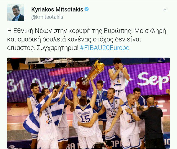 Τα συγχαρητήρια του, έδωσε ο Πρόεδρος της Νέας Δημοκρατίας, Κυριάκος Μητσοτάκης, στους Έλληνες «χρυσούς» πρωταθλητές Ευρώπης στο Μπάσκετ, που νίκησαν το Ισραήλ με σκορ 65-56 στο Ευρωπαϊκό Πρωτάθλημα, «FIBA U20 European Championship – Hellas2017», σε έναν εξαιρετικό τελικό που διεξήχθη στα «Δύο Αοράκια» του Ηρακλείου Κρήτης.