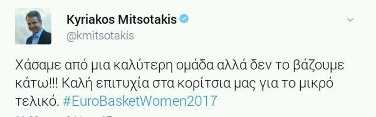 Μέσω του προσωπικού του λογαριασμού στο Twitter, ο Πρόεδρος της Ν.Δ. έγραψε: «Χάσαμε από μία καλύτερη ομάδα αλλά δεν το βάζουμε κάτω!!! Καλή επιτυχία στα κορίτσια μας, για το μικρό τελικό».