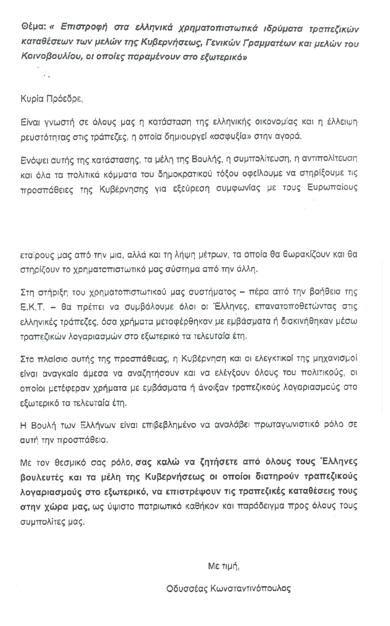 Με επιστολή του στην Πρόεδρο της Βουλής Ζωή Κωνσταντοπούλου ο βουλευτής Αρκαδίας του ΠΑΣΟΚ Οδυσσέας Κωνσταντινόπουλος ζητεί από όλους τους βουλευτές που διαθέτουν τραπεζικούς λογαριασμούς στο εξωτερικό την επιστροφή των τραπεζικών τους καταθέσεων στην Ελλάδα.