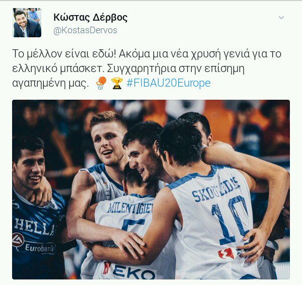 «Το μέλλον είναι εδώ! Ακόμα μία νέα χρυσή γενιά για το ελληνικό μπάσκετ. Συγχαρητήρια στην επίσημη αγαπημένη μας» έγραψε ο πρόεδρος της ΟΝΝΕΔ Κώστας Δέρβος στον προσωπικό του λογαριασμό στο Twitter, για την κατάκτηση του Χρυσού στο Ευρωπαϊκό Πρωτάθλημα, FIBA U20 European Championship – Hellas2017», που διεξήχθη στο Ηράκλειο Κρήτης.
