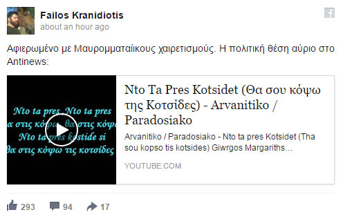 Αναλυτικά στο λογαριασμό του στο Facebook έκανε την ακόλουθη ανάρτηση: «Αφιερωμένο με Μαυρομματαίικους χαιρετισμούς. Η πολιτική θέση αύριο στο Αntinews»…