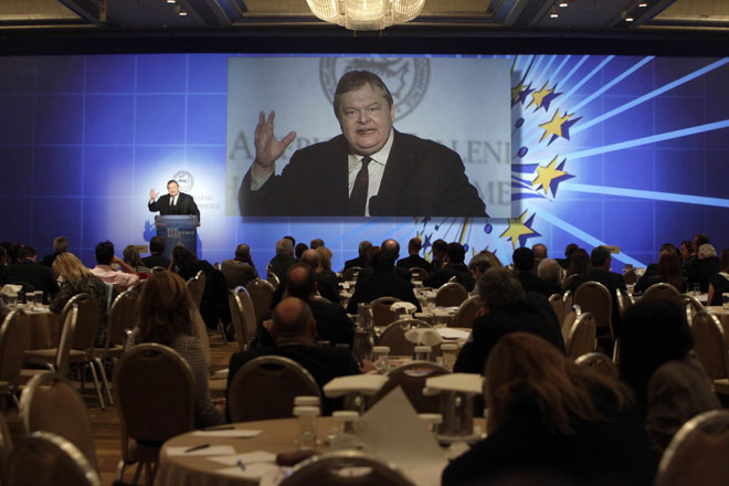 Ο πρόεδρος του ΠΑΣΟΚ μιλώντας σε συνέδριο του Ελληνοαμερικανικού Επιμελητηρίου, αναφερόμενος δια μακρών στις τεράστιες, οδυνηρές θυσίες του ελληνικού λαού και στις επιτευχθείσες προόδους, για να ζητήσει αντίστοιχη αντιμετώπιση από την Τρόικα και κυρίως, να μην προβάλλονται αδικαιολόγητες προκλήσεις προς την αντοχή της ελληνικής κοινωνίας και δημοκρατίας είπε: «Θέλουμε πραγματική αναγνώριση των θυσιών τού ελληνικού λαού, αναγνώριση των αντοχών του, όχι πρόσθετα δημοσιονομικά μέτρα που ”κανιβαλίζουν” τις μακροοικονομικές προοπτικές, έγκαιρη συζήτηση, προ των ευρωεκλογών, για την ολοκλήρωση του ελληνικού προγράμματος».