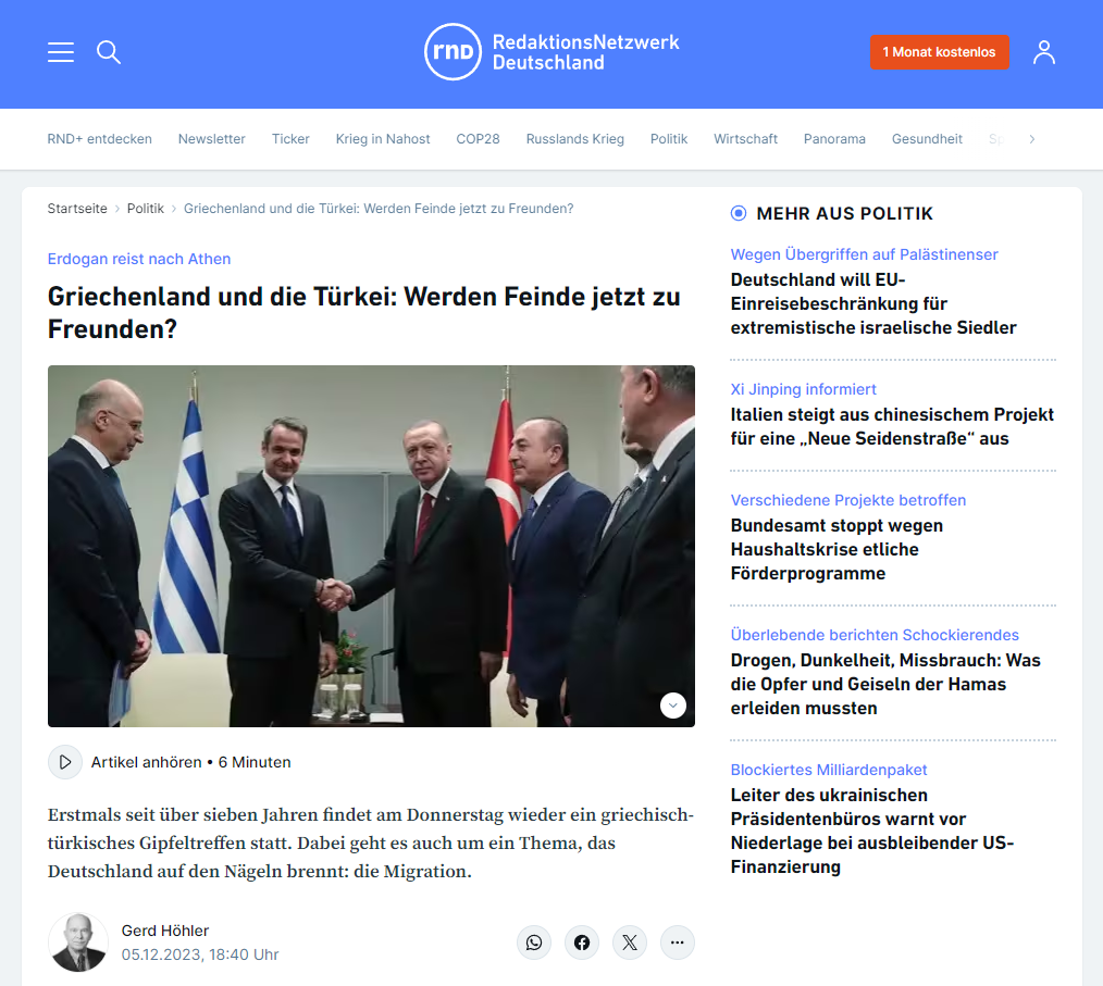 «Αλλά στο μεταξύ ο Ερντογάν έχει ηρεμήσει και πάλι. Ο Μητσοτάκης δεν είναι πλέον persona non grata γι’ αυτόν», αναφέρει το RND, σημειώνοντας ότι ο Έλληνας πρωθυπουργός και ο Τούρκος πρόεδρος συναντήθηκαν στη σύνοδο του ΝΑΤΟ στο Βίλνιους τον Ιούλιο και στο περιθώριο της Γενικής Συνέλευσης του ΟΗΕ στη Νέα Υόρκη τον Σεπτέμβριο, ενώ την περασμένη εβδομάδα ο Ερντογάν εξέφρασε σε συνέντευξή του την ελπίδα για την «έναρξη μιας νέας εποχής» στις ελληνοτουρκικές σχέσεις και την «αλλαγή σελίδας» που θα είναι αμοιβαία επωφελής και για τις δύο χώρες.