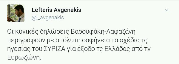 «Οι κυνικές δηλώσεις Βαρουφάκη-Λαφαζάνη, περιγράφουν με απόλυτη σαφήνεια τα σχέδια της ηγεσίας του ΣΥΡΙΖΑ για έξοδο της Ελλάδας από την Ευρωζώνη», επεσήμανε με σχετική του ανάρτηση στο twitter, o Γραμματέας Πολιτικής Επιτροπής της Νέας Δημοκρατίας, Βουλευτής Ηρακλείου, Λευτέρης Αυγενάκης.