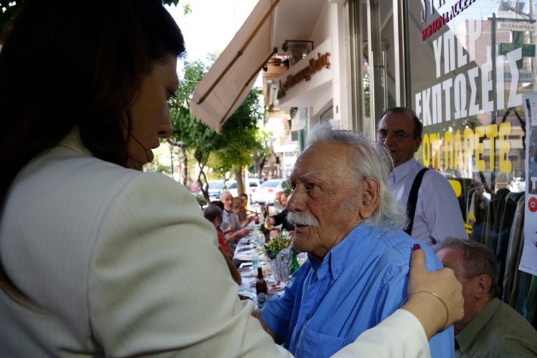 Λίγο πριν από το μεσημεριανό τσιμπούσι ο επικεφαλής της ΛΑΕ περπάτησε στις γειτονιές της περιοχής για να σφίξει το χέρι των ψηφοφόρων και να πάρει τα μηνύματά τους, ενώ αργότερα στο ουζερί όλοι σηκώθηκαν όρθιοι και χειροκρότησαν μόλις έφτασε ο μεγάλος αγωνιστής της Αριστεράς Μανώλης Γλέζος, ο οποίος με τη σειρά του τους ευχαρίστησε εγκάρδια.