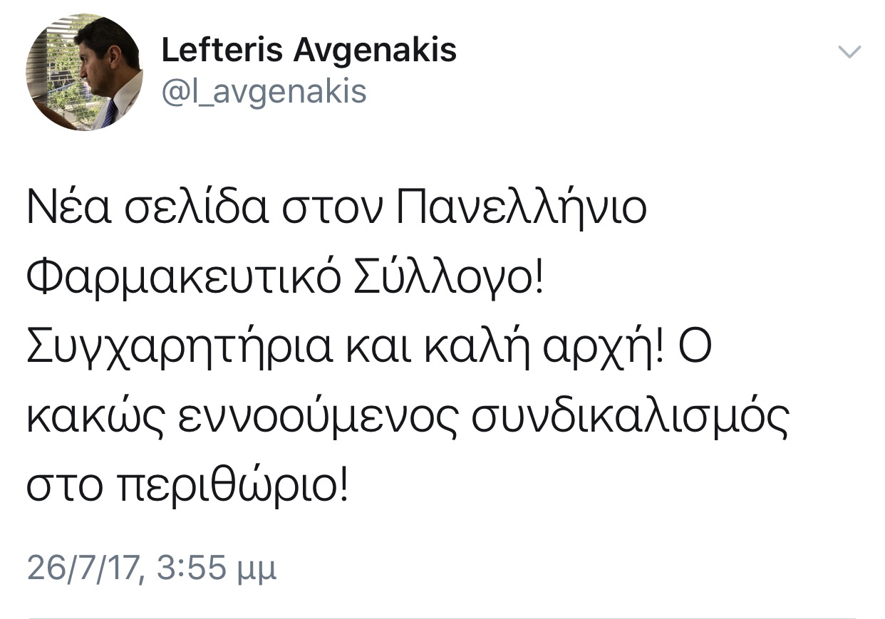 Σχετική ανάρτηση στον προσωπικό του λογαριασμό στο Twitter έκανε ο κ. Αυγενάκης, τονίζοντας: «Νέα σελίδα για τον Πανελλήνιο Φαρμακευτικό Σύλλογο! Συγχαρητήρια και καλή αρχή! Ο κακώς εννοούμενος συνδικαλισμός στο περιθώριο».