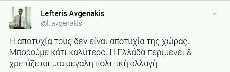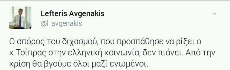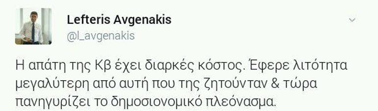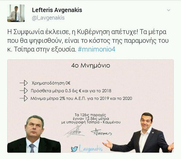 Συγκεκριμένα και μέσω του προσωπικού του λογαριασμού στο Twitter, ο Γραμματέας Π.Ε. έγραψε: «Η Συμφωνία έκλεισε, η Κυβέρνηση απέτυχε! Τα μέτρα που θα ψηφιστούν, είναι το κόστος της παραμονής του κ. Τσίπρα στην εξουσία».