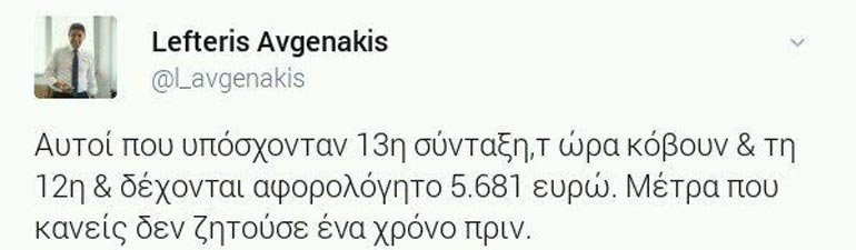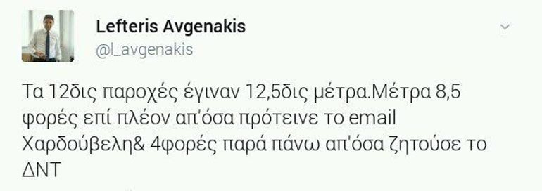 Νωρίτερα, ο κ. Αυγενάκης, είχε παρατηρήσει μέσω του προσωπικού του λογαριασμό στο Twitter: «Η απάτη της Κυβέρνησης έχει διαρκές κόστος. Έφερε λιτότητα μεγαλύτερη από αυτή που της ζητούσαν και τώρα πανηγυρίζει το δημοσιονομικό πλεόνασμα. Έφεραν 4ο Μνημόνιο χωρίς χρηματοδότηση, πρόσθετα μέτρα μισού δις ευρώ και για το 2018. Μόνιμα μέτρα 2% του ΑΕΠ για το 2019 και το 2020».