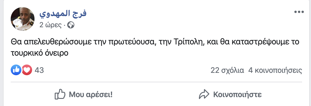 Αργά το βράδυ ο ναύαρχος Φάρατζ ελ Μαχντάουϊ , έγραψε στην προσωπική του σελίδα στο facebook ,στα ΕΛΛΗΝΙΚΑ το εξής μήνυμα: