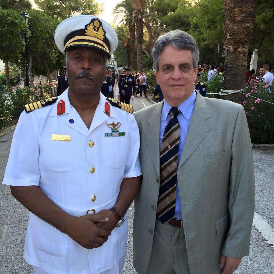 Πίσω του διακρίνεται ο σημερινός πρόεδρος του Πολεμικού Μουσείου Αντιναύαρχος ε.α Αθανάσιος Παναγόπουλος. Οι δυο τους είχαν συναντηθεί πριν από 35 χρόνια στη Σχολή Ναυτικών Δοκίμων.