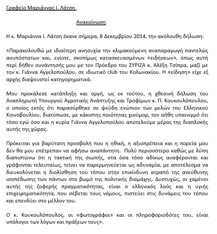 Για ανυπόστατες και κατασκευασμένες ειδήσεις κάνει λόγο η Μαριάννα Λάτση, όσον αφορά τις καταγγελίες του βουλευτή του ΠΑΣΟΚ, Πάρι Κουκουλόπουλου, για τα περί συνάντησης του Αλέξη Τσίπρα με την ίδια και την Γιάννα Αγγελοπούλου.