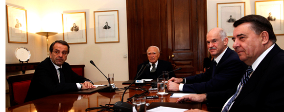 «Υπό την προεδρία του Προέδρου της Δημοκρατίας κ. Κάρολου Παπούλια, συναντήθηκαν σήμερα ο πρωθυπουργός κ. Γ. Παπανδρέου, ο αρχηγός της αξιωματικής αντιπολίτευσης κ. Αντώνης Σαμαράς και ο πρόεδρος του ΛΑΟΣ, Γ. Καρατζαφέρης.