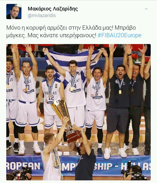 «Μόνον η κορυφή αρμόζει στην Ελλάδα μας! Μπράβο μάγκες. Μας κάνατε υπερήφανους!» έγραψε χαρακτηριστικά ο Διευθυντής του Γραφείου Τύπου της Νέας Δημοκρατίας, Μακάριος Λαζαρίδης, στον προσωπικό του λογαριασμό στο Twitter, για την κατάκτηση του Ευρωπαϊκού Πρωταθλήματος , FIBA U20 European Championship – Hellas2017», που διεξήχθη στο Ηράκλειο Κρήτης.