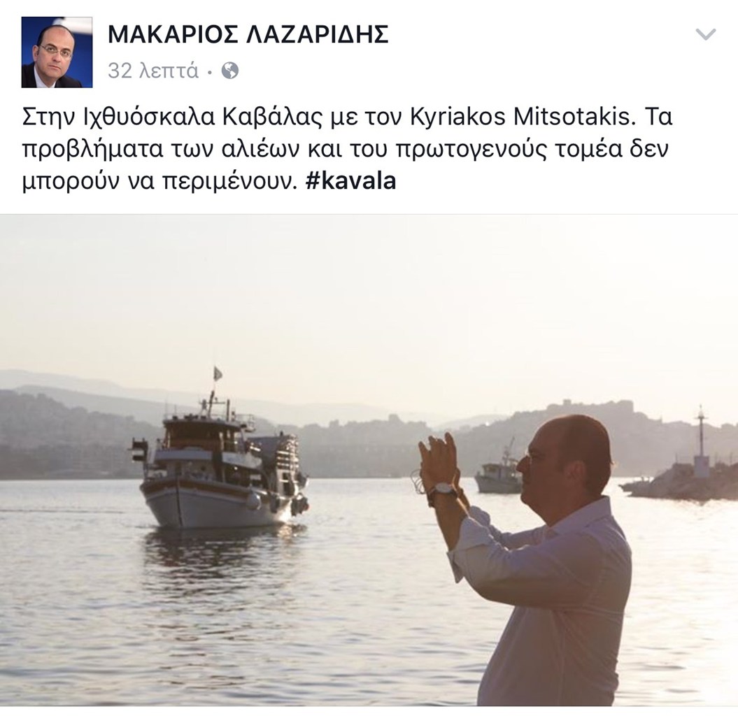 Ο κ. Λαζαρίδης κοινοποίησε σχετική ανάρτηση στον προσωπικό του λογαριασμό στο Facebook στο πλαίσιο της διήμερης περιοδείας του Προέδρου της Νέας Δημοκρατίας, Κυριάκου Μητσοτάκη, σε Καβάλα, Θάσο και Δράμα, τον οποίο και συνοδεύει.