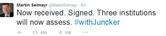 Ωστόσο, λίγη ώρα αργότερα, με νέο μήνυμά του το «δεξί χέρι» του Ζαν-Κλοντ Γιούνκερ ενημέρωνε ότι ένα υπογεγραμμένο έγγραφο με τις ελληνικές προτάσεις έφθασε στις Βρυξέλλες και μπορεί πλέον να εξεταστεί από τους τρεις θεσμούς (ΕΚΤ, ΕΕ, ΔΝΤ).