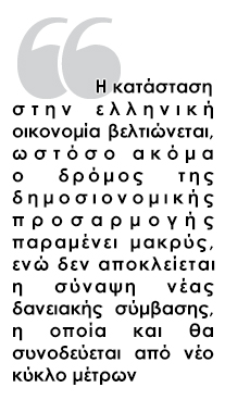 Ειδικότερα, η κατάσταση στην ελληνική οικονομία βελτιώνεται, ωστόσο ακόμα ο δρόμος της δημοσιονομικής προσαρμογής παραμένει μακρύς, ενώ δεν αποκλείεται η σύναψη νέας δανειακής σύμβασης, η οποία και θα συνοδεύεται από νέο κύκλο μέτρων. Οι εκτιμήσεις και οι προειδοποιήσεις είναι ξεκάθαρες, ειδικά μετά την πρόσφατη απόφαση του ΣτΕ με τη δικαίωση των ένστολων, όπου πλέον το ΥΠΟΙΚ καλείται να βρει την κατάλληλη φόρμουλα για την αποκατάσταση των μισθών σε επίπεδα 2012 και για καταβολή των αναδρομικών.