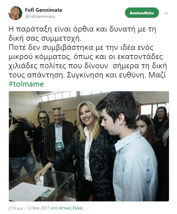 «Η παράταξη είναι όρθια και δυνατή με τη δική σας συμμετοχή. Ποτέ δεν συμβιβάστηκα με την ιδέα ενός μικρού κόμματος. Όπως και οι εκατοντάδες χιλιάδες πολίτες που δίνουν σήμερα τη δική τους απάντηση. Συγκίνηση και ευθύνη. Μαζί #tolmame»